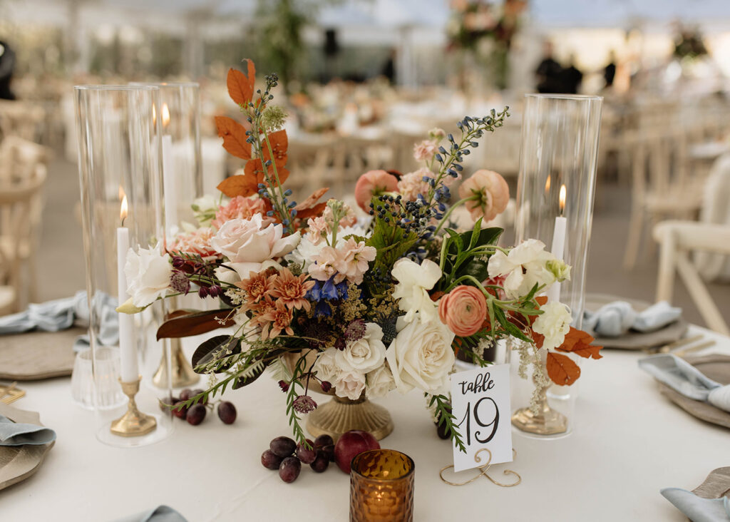 After their ceremony concluded, guests were invited to refill their drinks at the rustic bar and enjoy each other’s company along the river. The fire pits and bistro lights set the coziest atmosphere for their guests to mingle before dinner! Misha and Andrew’s reception was set underneath the venue’s large, sailcloth tent, which is always in place from May – October. Inspired by Misha’s unique dress, the color palette and floral arrangements absolutely stole the show. Somehow they perfectly blended notoriously “spring” colors with more rustic, fall foliage.